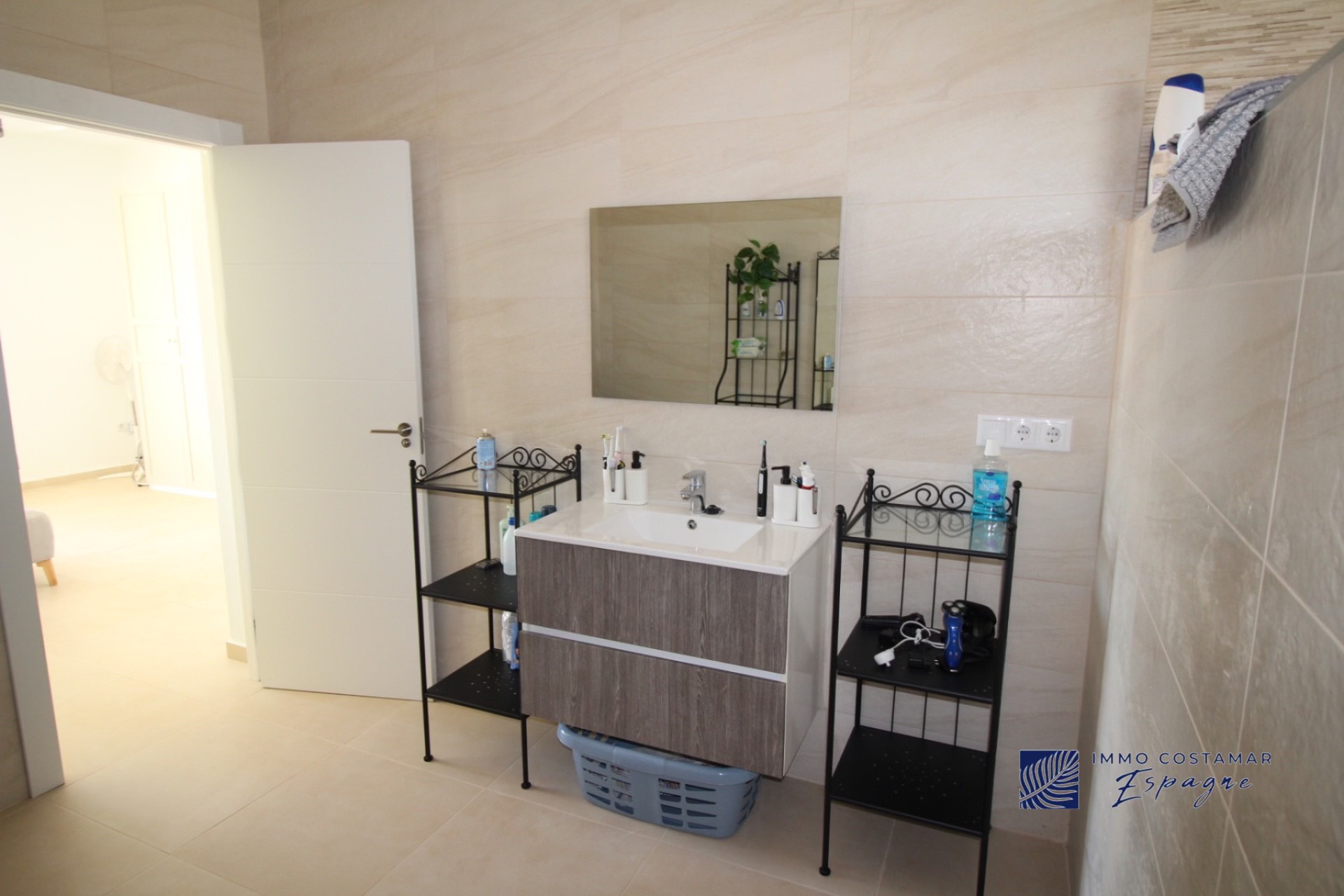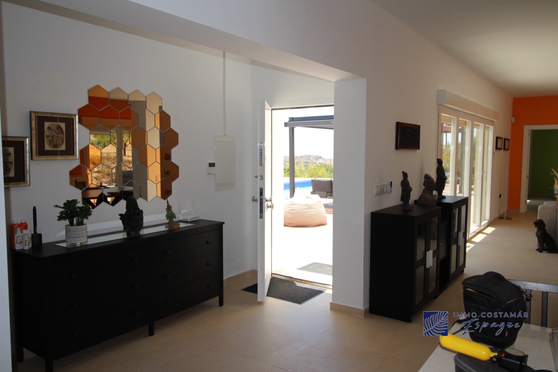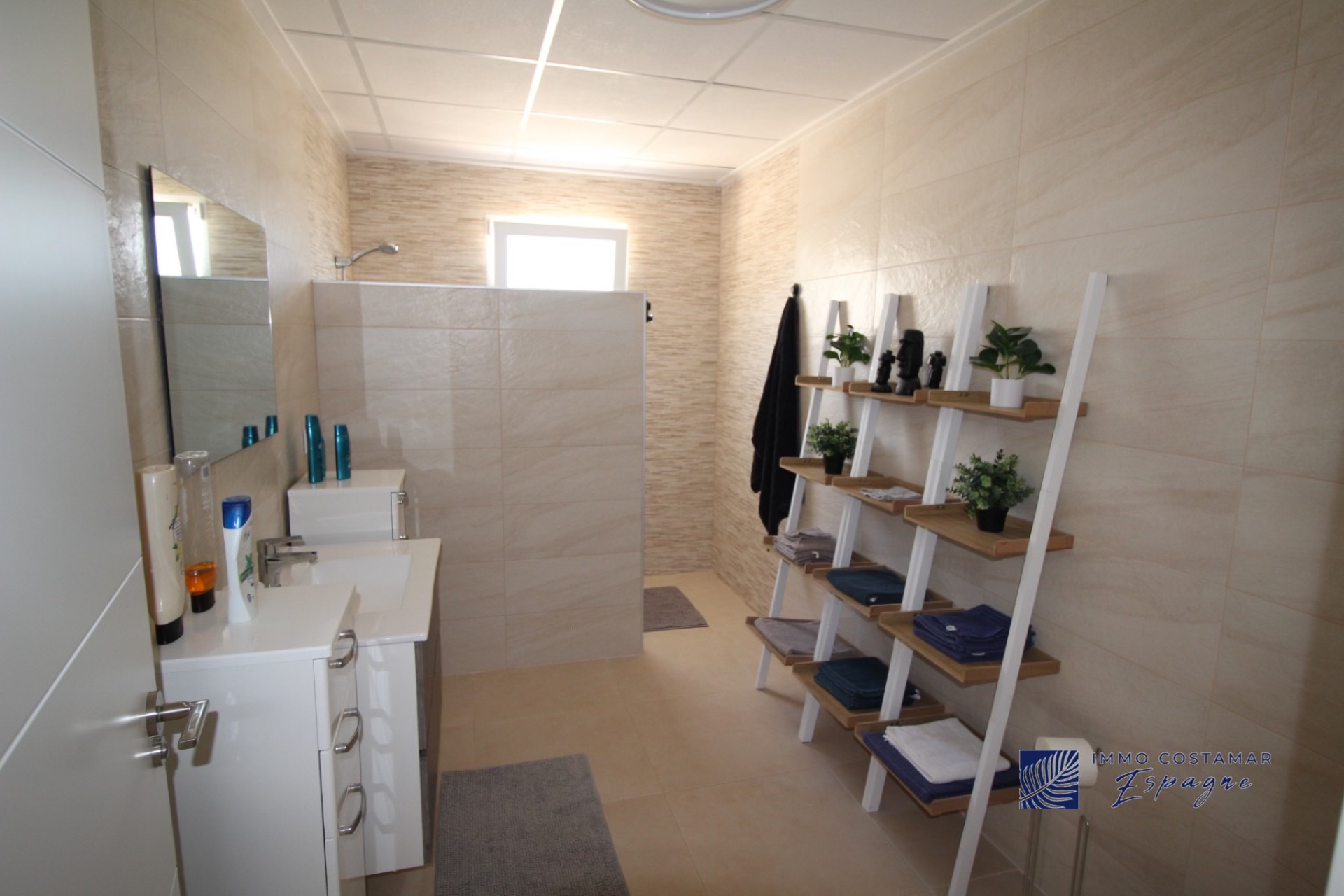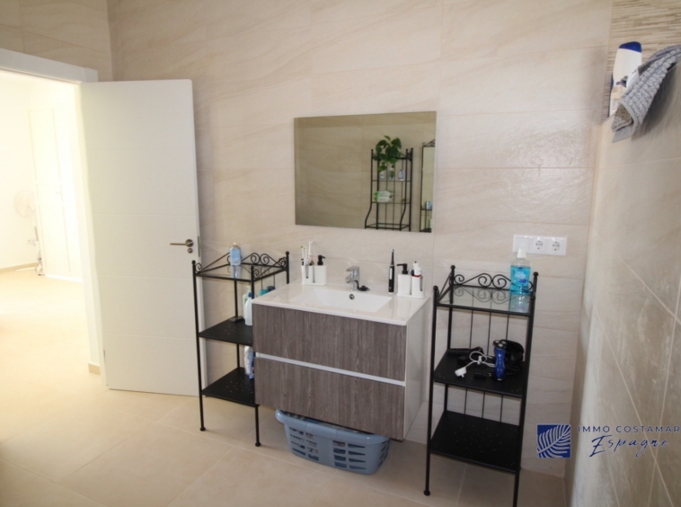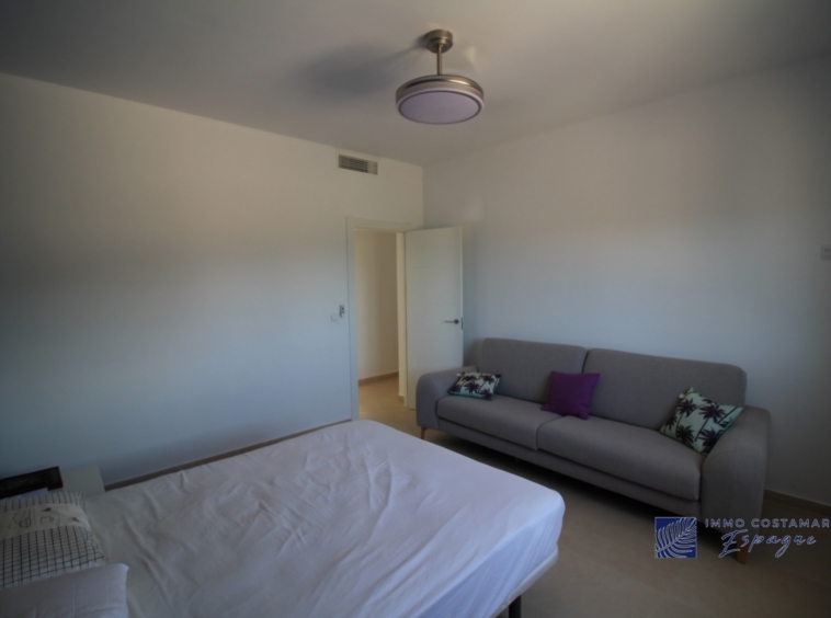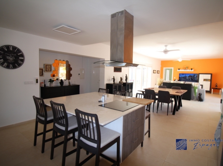 La villa se compose d’un hall d’entrée, d’ un espace de vie (salon/salle à manger/ cuisine ouverte) de 70m2 avec 2 baies vitrées donnant chacune sur une terrasse. Il y a également une troisième terrasse sur le côté pour profiter du soleil dès le petit déjeuner. Il y a 4 chambres de belles dimensions et 3 salles de bain dont 2 directement en suite. Une des chambres se trouve à l’extrémité de la construction et est totalement indépendante.