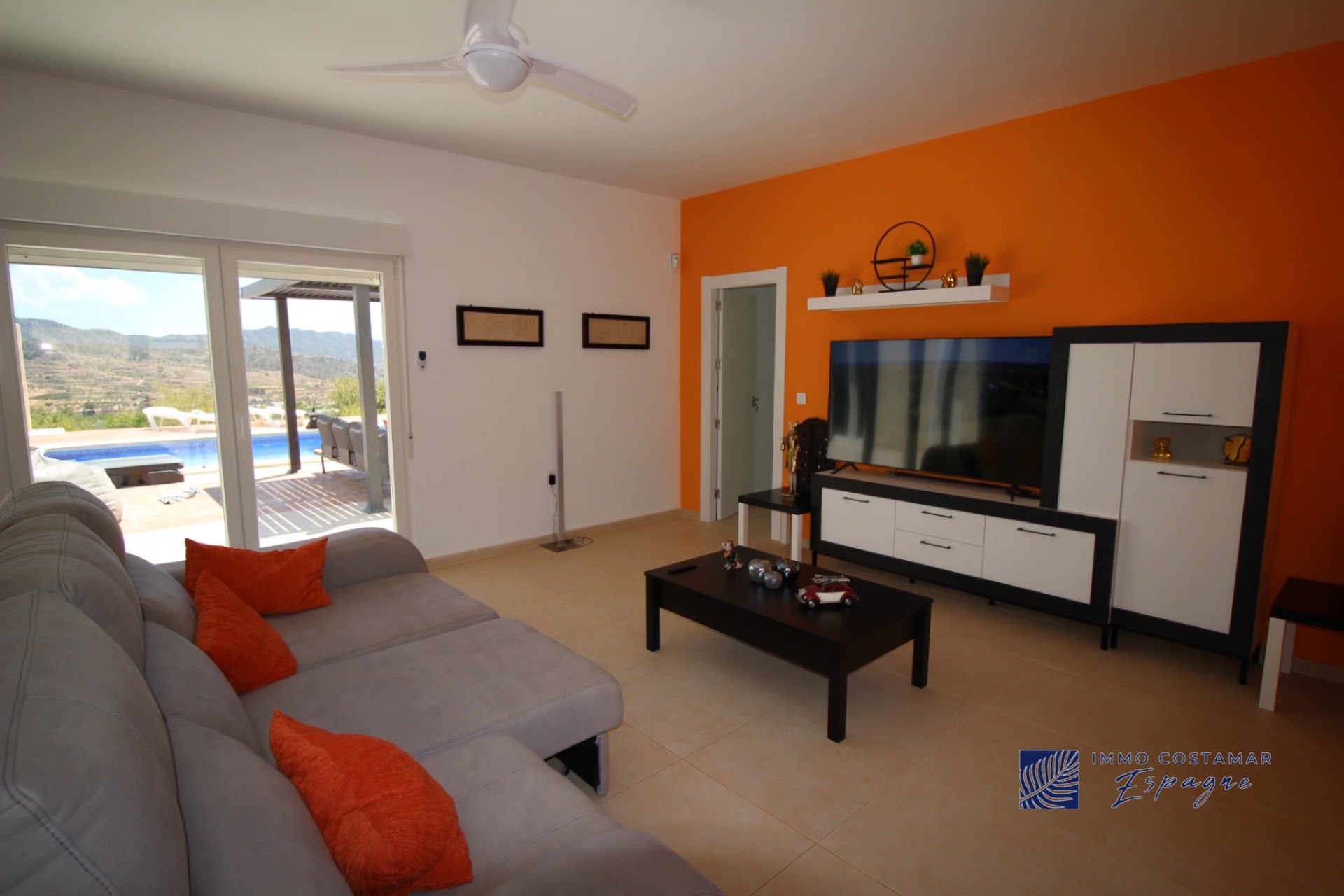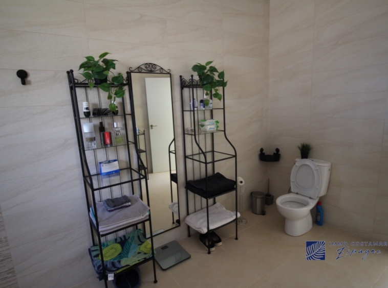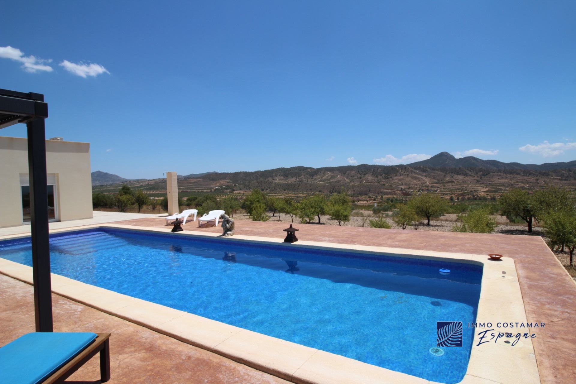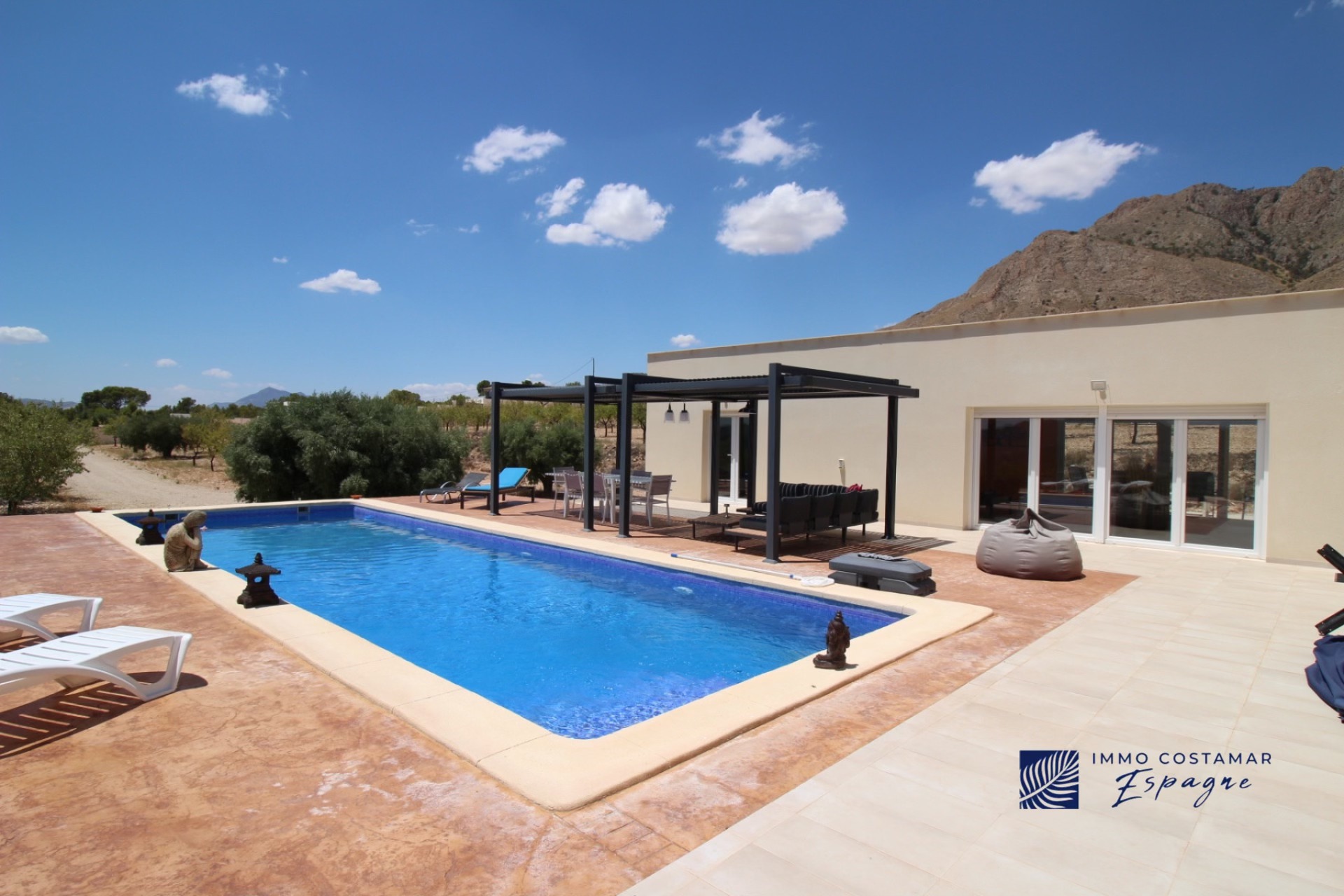 Sur l’avant, une grande terrasse donne sur la magnifique piscine (12,5×4 m) chauffée par une pompe à chaleur et offre des vues vraiment incroyables. Sur cette terrasse se trouve une pergola pour profiter du paysage en étant à l’ombre.