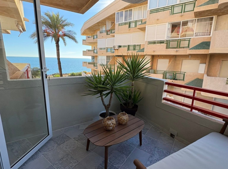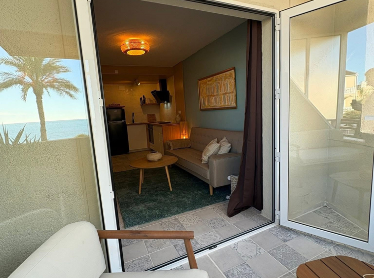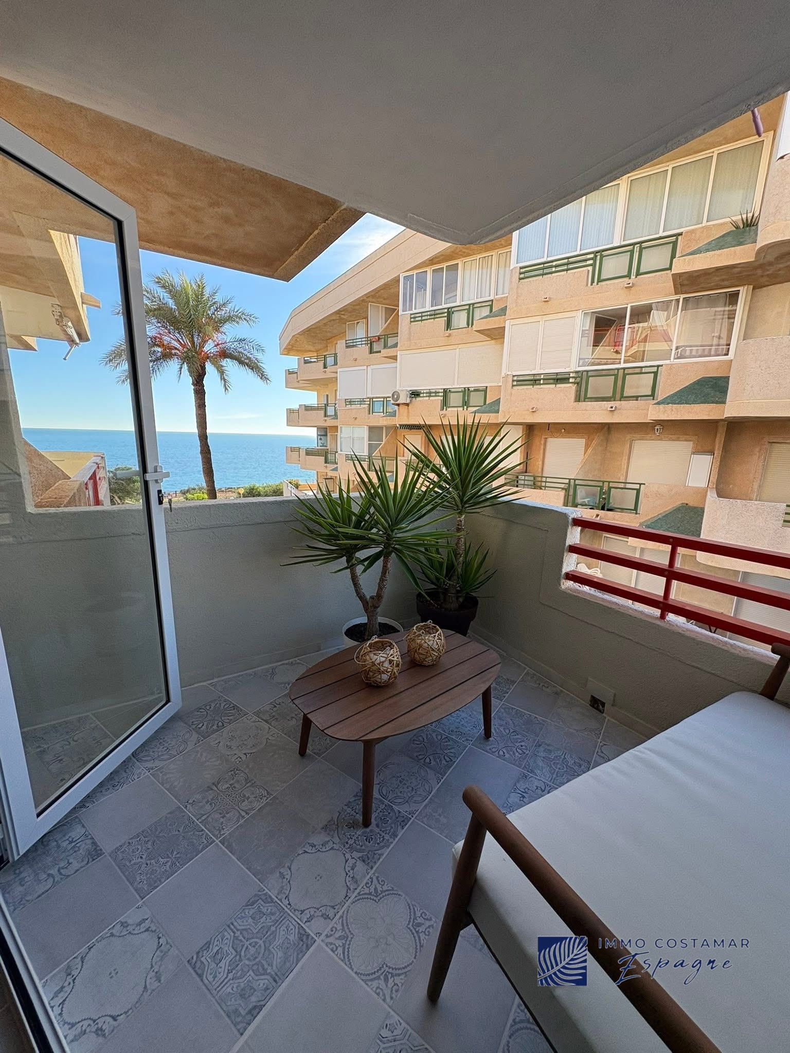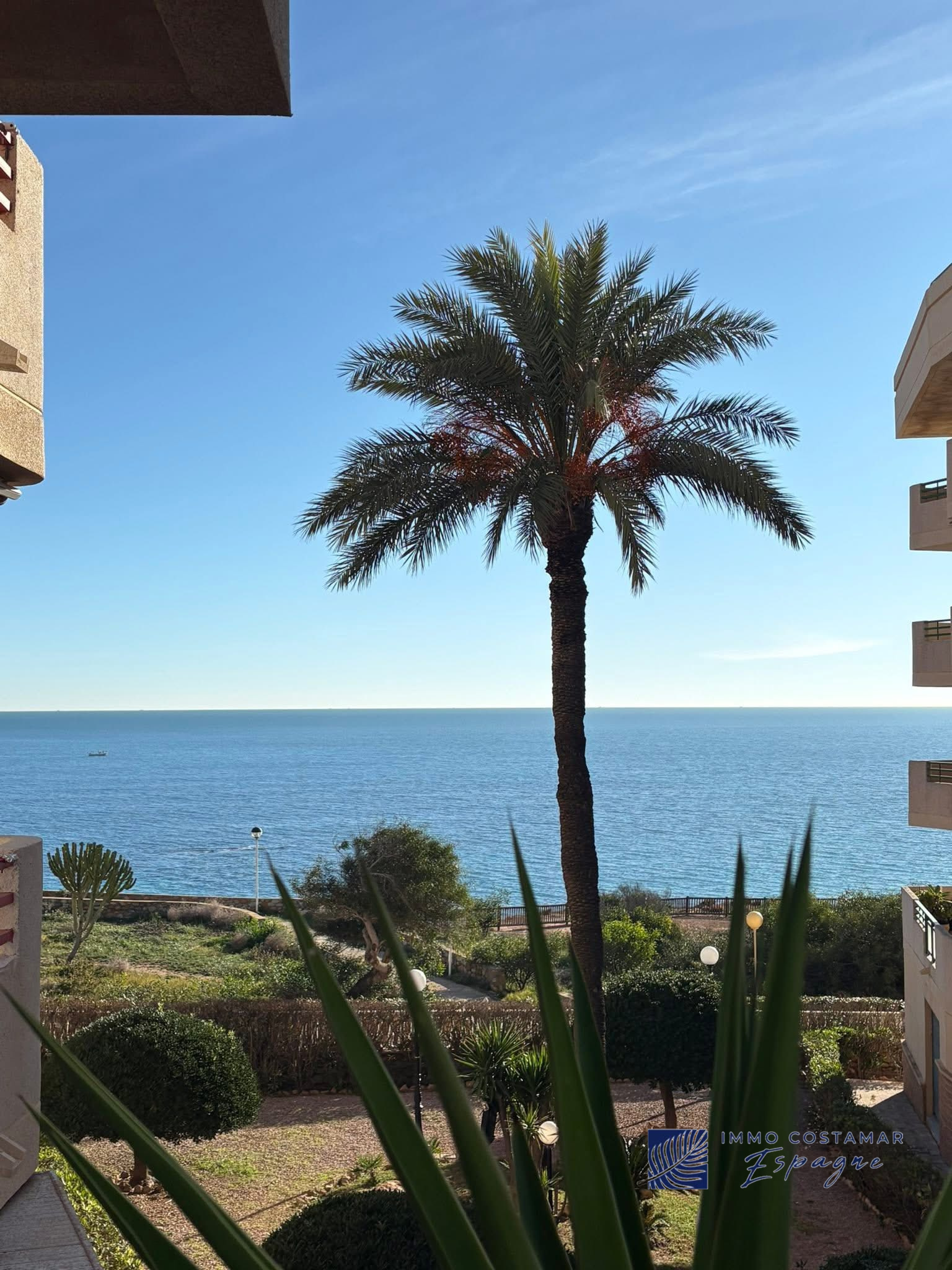 Studio rénové avec canapé-lit, balcon exposé sud avec vue mer, piscine commune en bord de mer à Mil Palmeras, Orihuela Costa