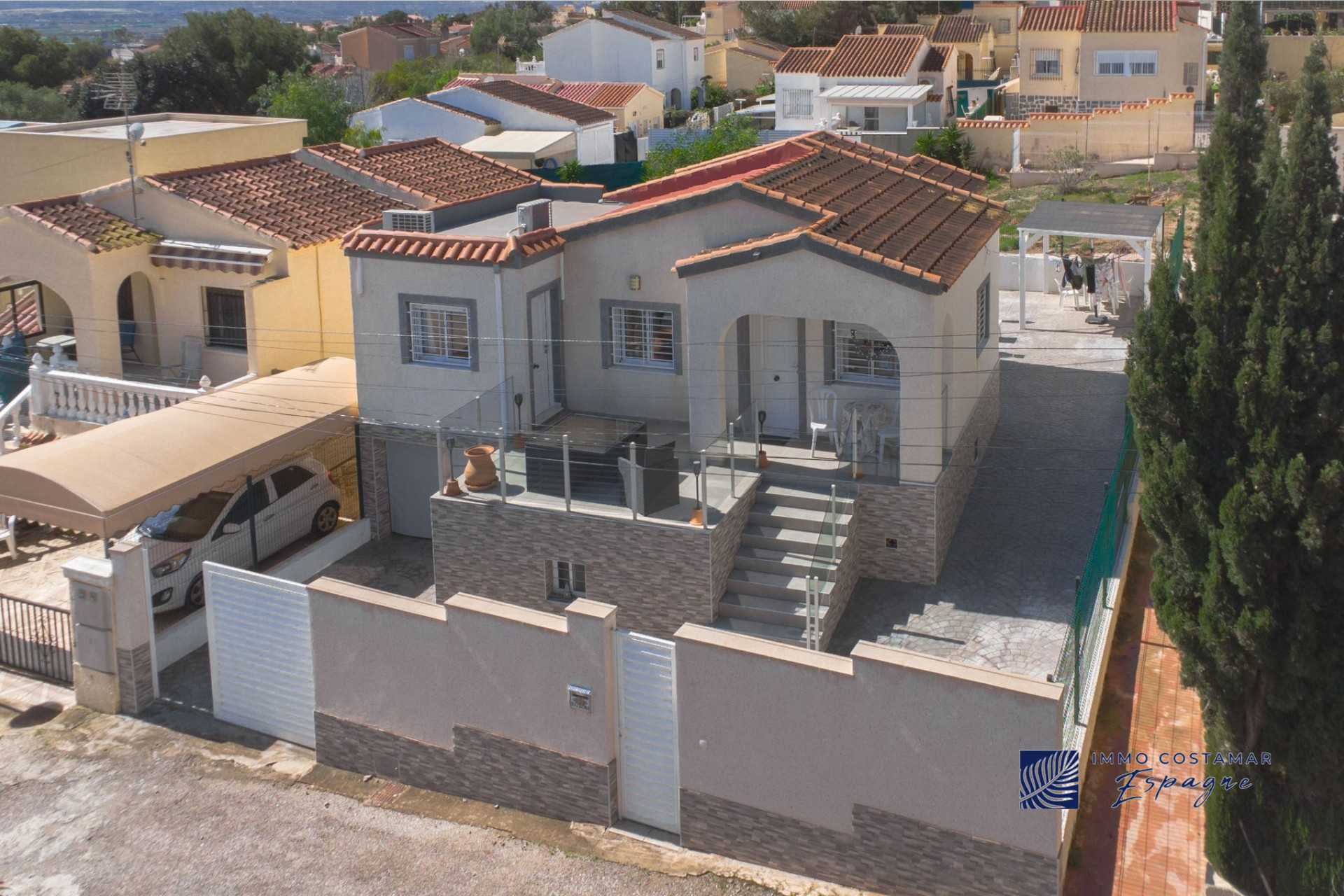Les autres caractéristiques comprennent une terrasse prolongée pour un espace extérieur supplémentaire, une porte d’entrée blindée, la climatisation, des grilles de sécurité et un enduit extérieur imperméable de haute qualité ne nécessitant aucun entretien, un jardin en béton pressé, une cuisine et une salle de bain rénovées, une annexe, des murs en cotegran, des balustrades en verre et bien plus encore. La villa est mise en vente partiellement meublée, mais avec tous les électroménagers inclus. Cette fantastique villa individuelle offre une excellente opportunité de vivre confortablement dans un style méditerranéen dans un emplacement privilégié.